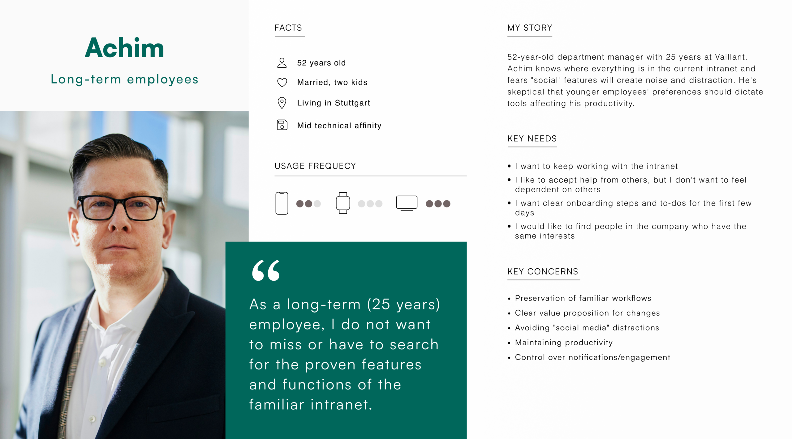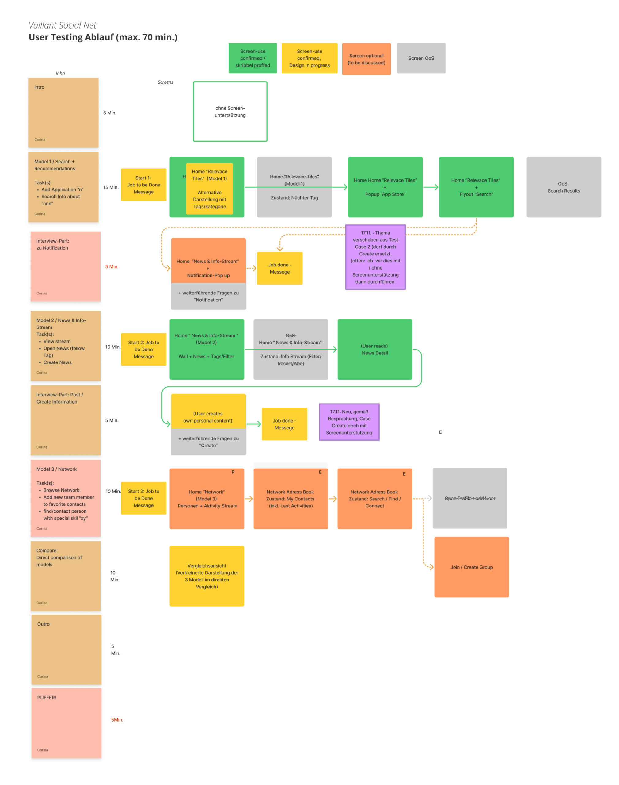 Rationale: Hans (our long-term employee persona) is already skeptical of change. Testing with gray-box wireframes would create additional cognitive load interpreting „what this will actually look like,“ potentially biasing feedback. Brand-consistent mockups let participants focus on functionality and information architecture rather than visual design speculation.